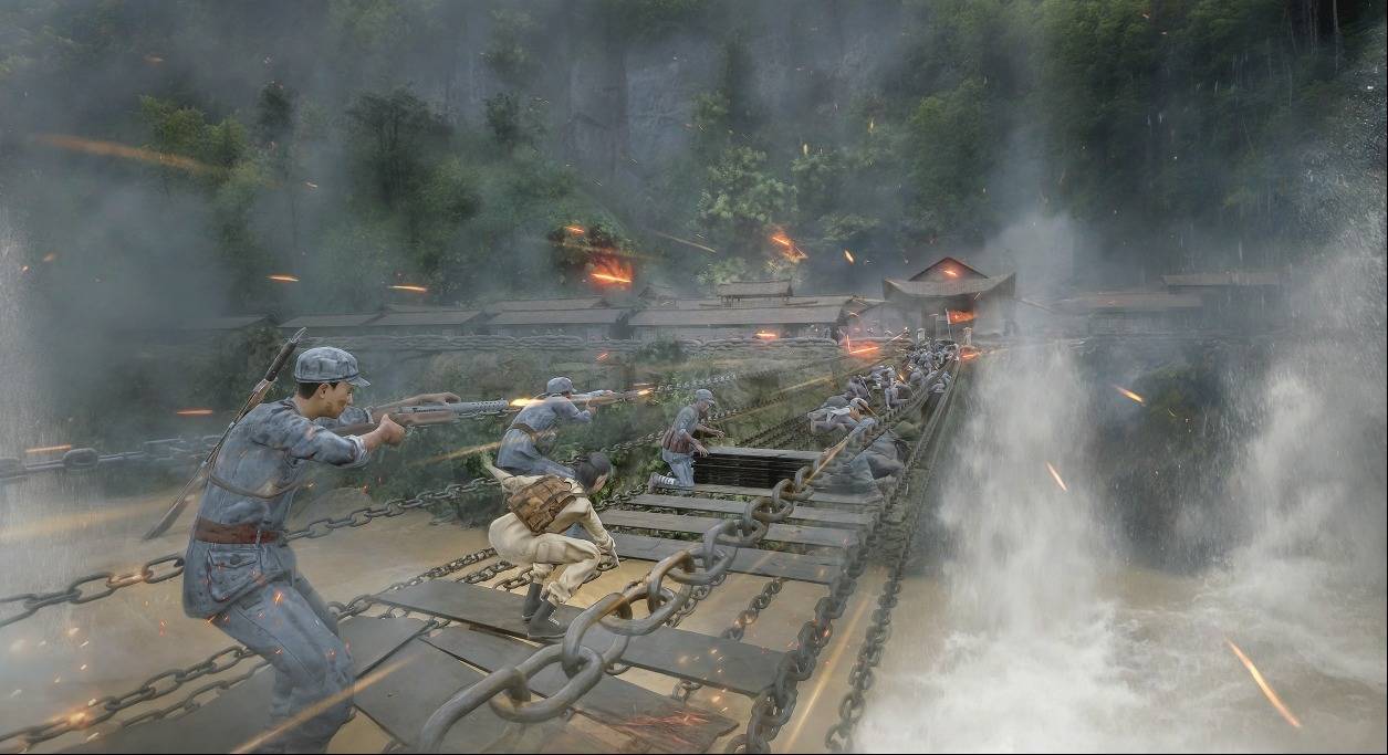 r在抢夺泸定桥的场景中,眼前是铁索横江、江水奔腾,游客将手持仿真枪械参与模拟战斗场景,在枪林弹雨中与身旁的“战友们”奋勇向前打击敌人;在遵义会议的场景中,游客仿佛一步跨入了1935年那间肃穆的会议室,走近每一位正在激烈讨论的历史人物身旁,观察他们眉宇间的沉思、焦虑与坚定。