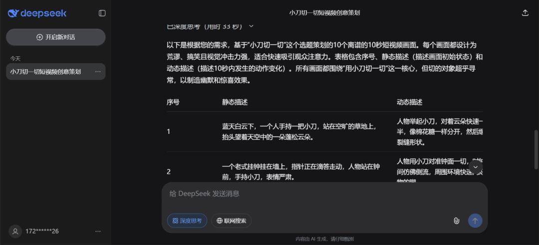 我们先继续返回到DeepSeek,找到刚才我们生成提示词的聊天记录那里,把刚才我们相对应的“动态描述”作为生成视频的提示词进行复制
