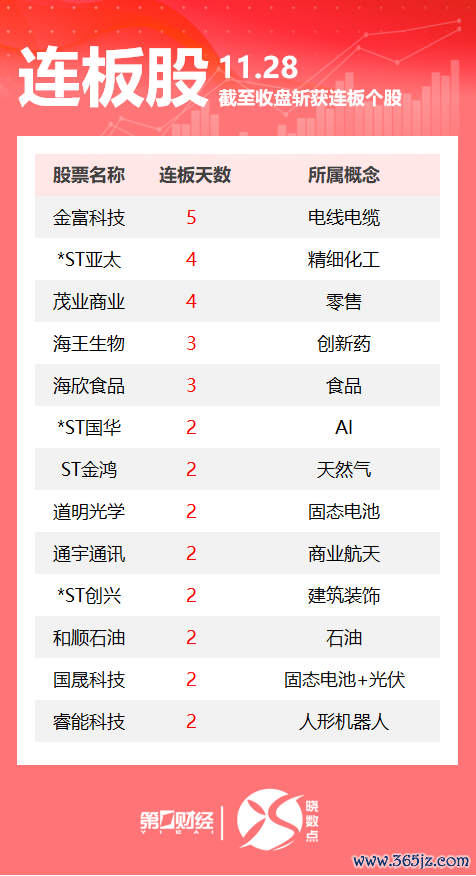 11月28日小麦策略,Wind数据显示,A股市场共计82只个股涨停。其中电线电缆概念金富科技收获5连板,零售股茂业商业4连板。一图速览今日连板股>>小麦策略